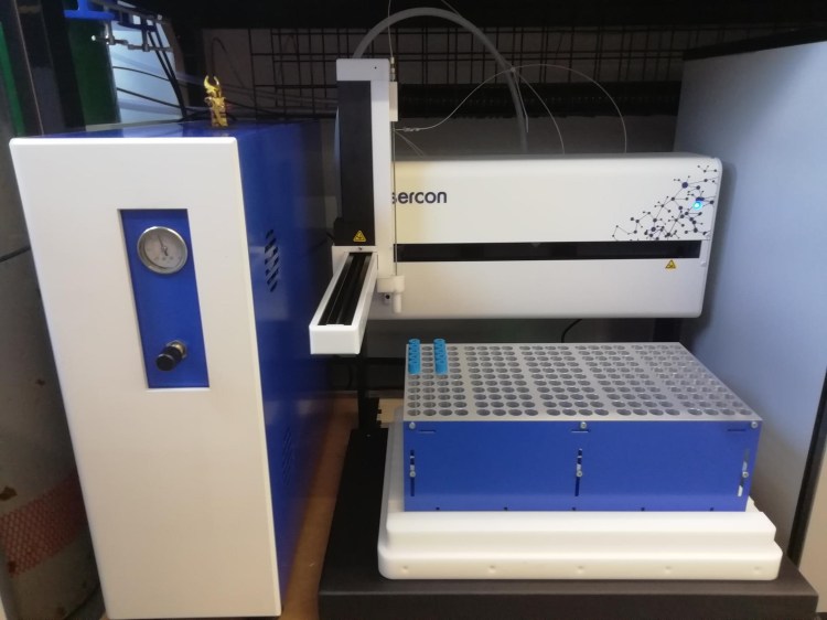 We have recently installed a Sercon XYZ autosampler (aka Heimdallr) for offline helium flushing of carbonate samples prior to analysis. Heimdallr is capable of flushing batches of up to 240 samples, doubling our throughput.