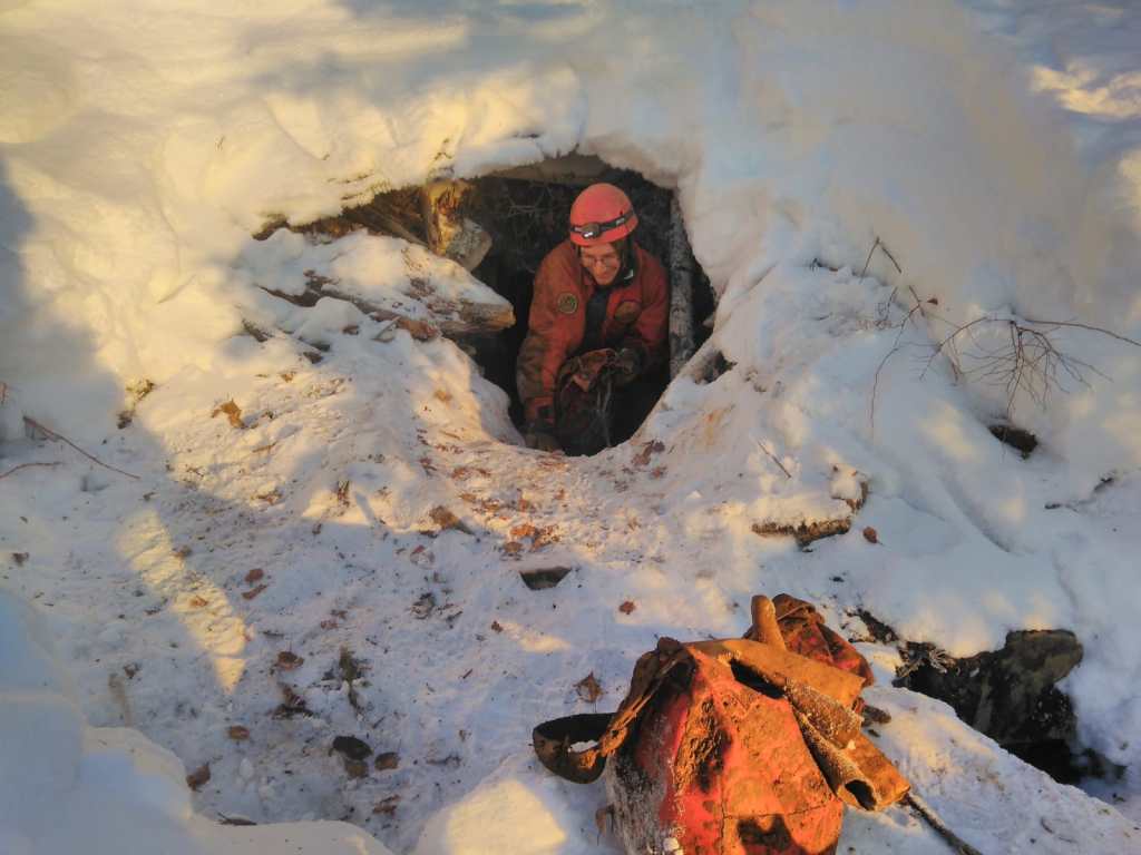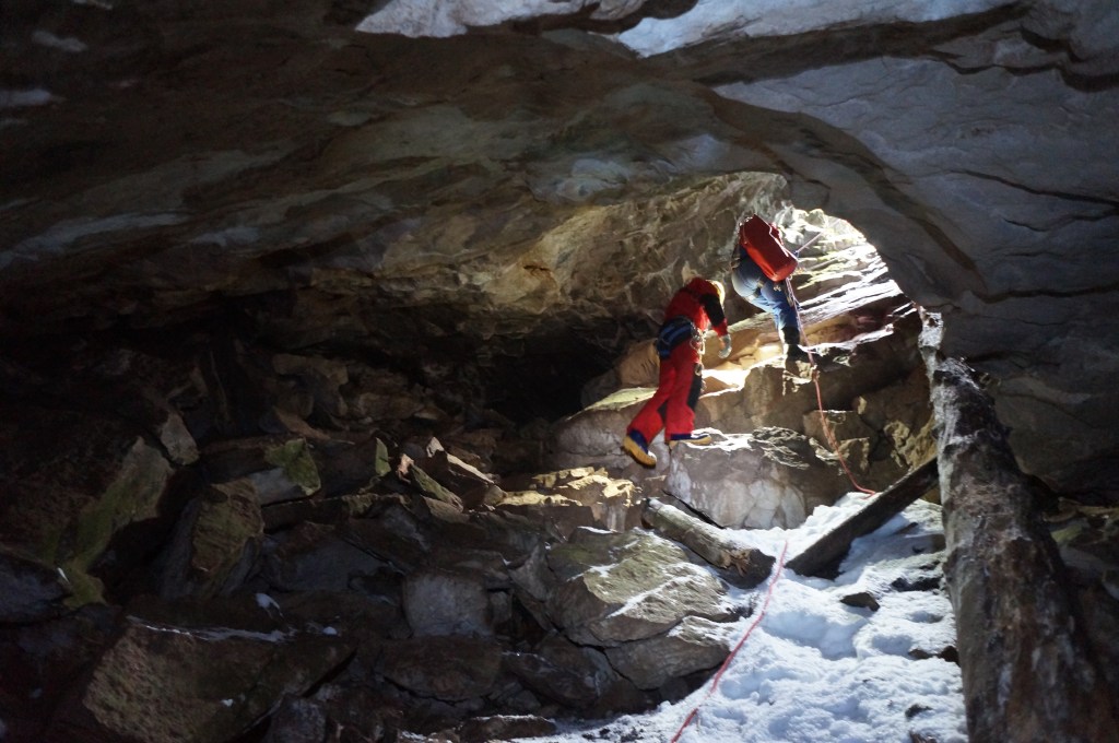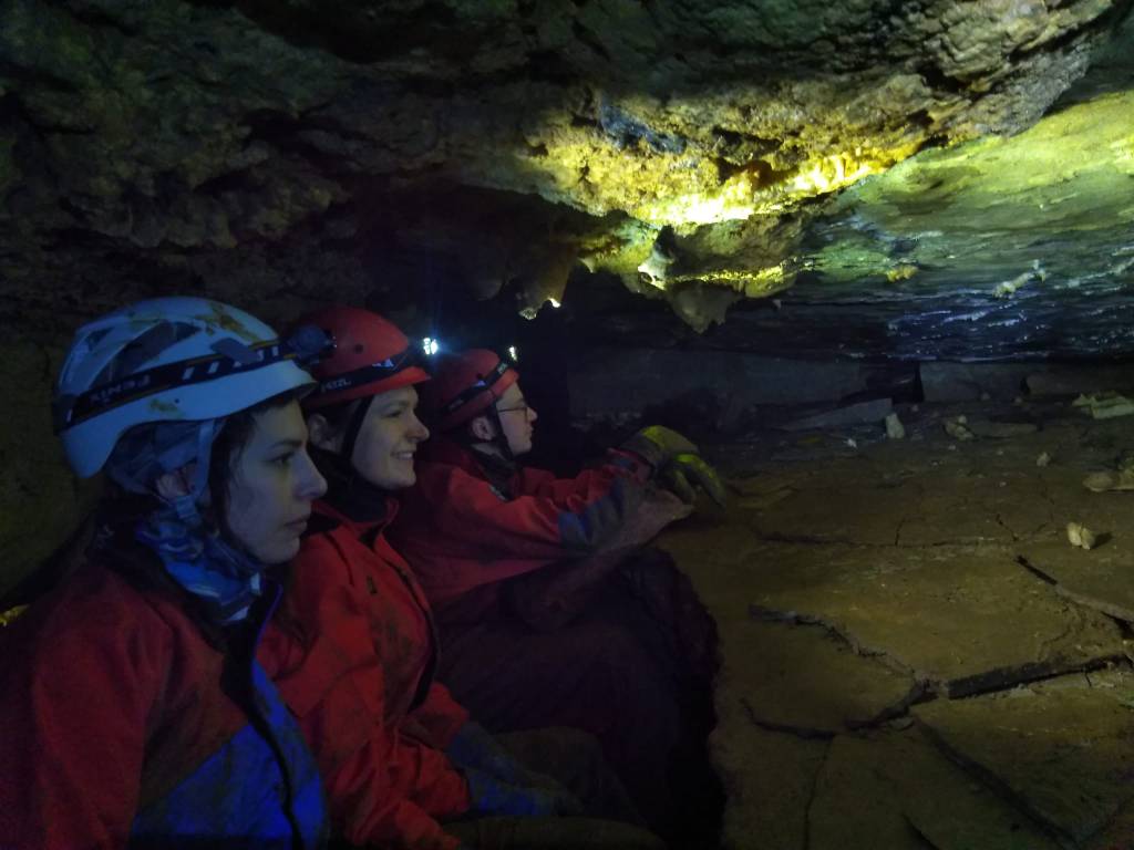 After a day setting up camp, collecting firewood and water from the nearby Botovskaya river, the science began! The cave was still a 3 km hike from the base camp up a steep slope in dense snow – tiring work but worth the effort once we saw what awaited us! Botovskaya is a sprawling 70 km maze of tunnels, often only 40 – 50 cm tall so that you need to crawl through the thick mud that has settled in the base of the cave. Our Russian guides are the experts and safety is the priority at all times. These guys know the cave inside out and seem to move over boulders and through tunnels with unimaginable ease. I’m grateful for their patience waiting for five slow moving European scientists fumbling along behind!