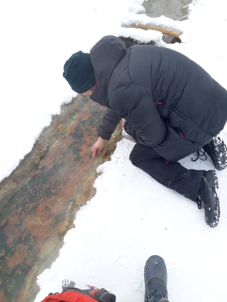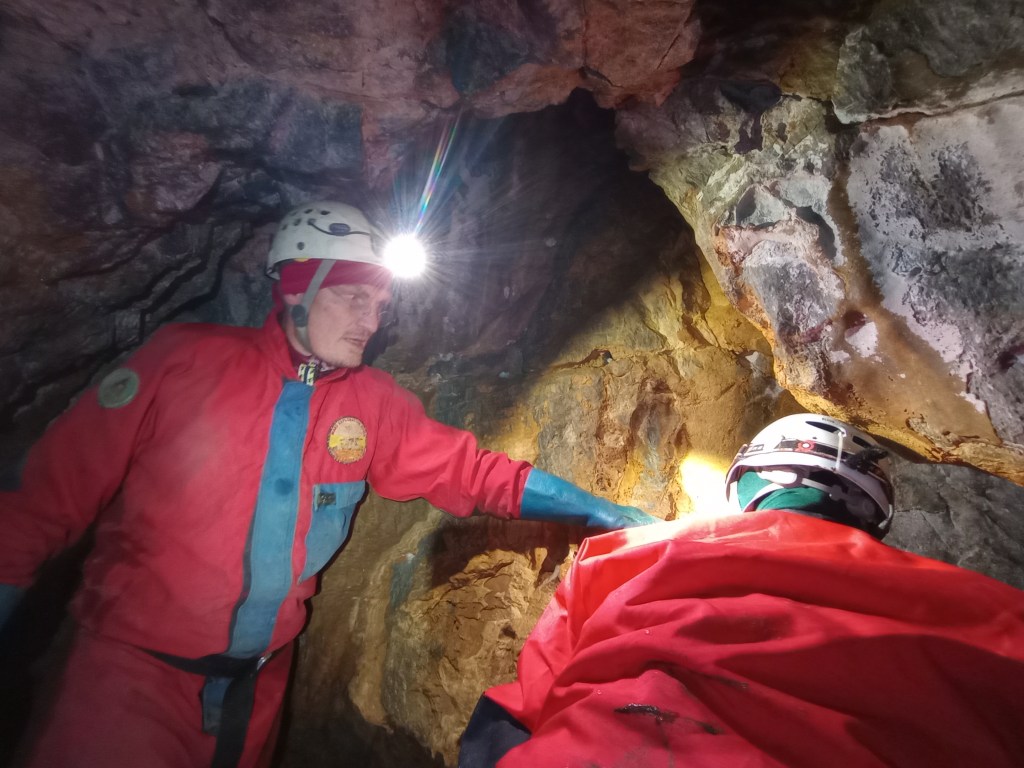 The hunt was on for more carbonate samples and opportunities to set up monitoring equipment to measure temperature and environmental conditions. Such monitoring will help us interpret our palaeoclimatic measurements back in the lab. Jade and Seb bagged lots of cryocarbonate samples – calcium carbonate that rapidly precipitates out of water when it freezes or melts. If we can date these samples, we will know the exact timing of the onset/end of sub-zero conditions in the region. We also obtained several flowstones, and a stalagmite which we can use to infer palaeo-environmental conditions. But we were careful not to take too much – it’s important to ensure that the material contains enough Uranium to obtain reliable formation dates – and we won’t know this until we can get it back to the lab. If it proves fruitful, we know there’s plenty of great material still to collect at Argarakan.