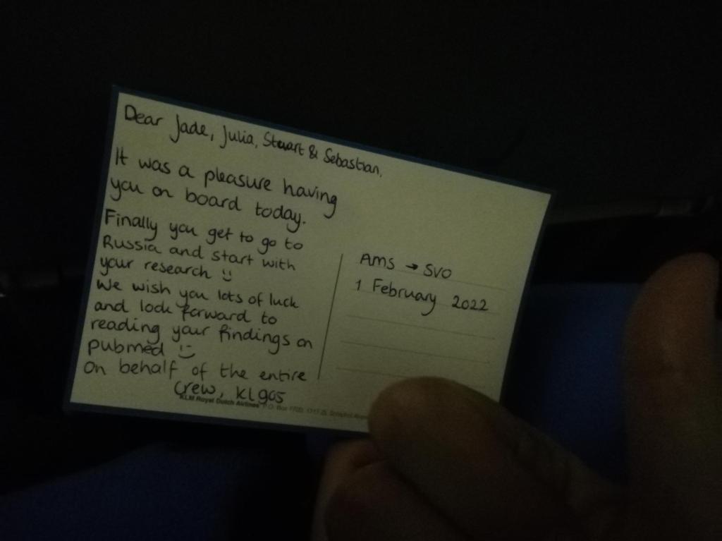 We’ve made it to Siberia! We left Newcastle on February 1st and travelled for 17 hours, stopping at Amsterdam, where we picked up our colleague Julia Homann from the university of Mainz, then onto Moscow. Our PI Seb, always keen to promote our work, managed to brief the flight attendants on our project before we’d even taken off. In exchange for their newly acquired expertise in permafrost, they kindly gave us a send off with a few bottles of wine and snack – A great start!