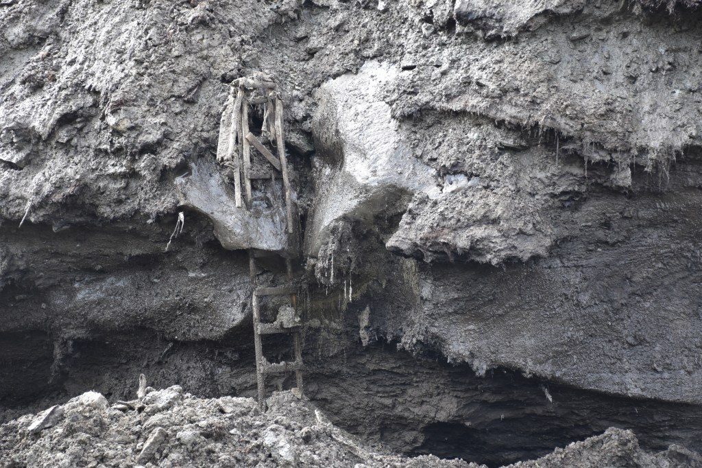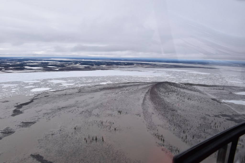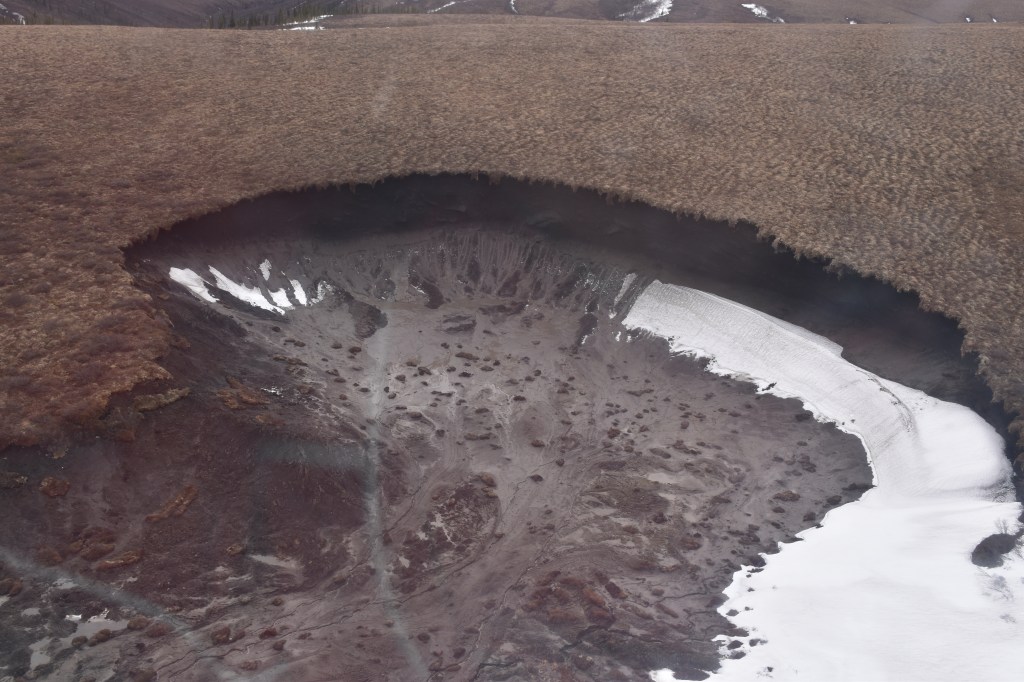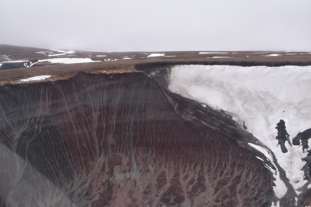 Warming in recent years has led to a high number of thaw slumps in this region as underground ice becomes unstable. In the Richardson Mountains, this is mostly buried ice from the last ice age. During our flights we saw several dozen thaw slumps in various sizes and stages of activity. Although we didn’t spot anything as large as the Batagay Megaslump in Siberia, some of the steep walls were simply too high to reach the ice wedges, or to work safely.